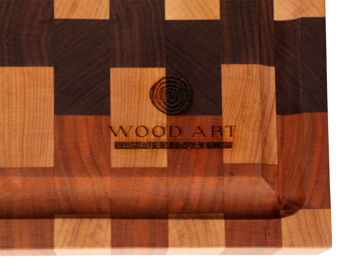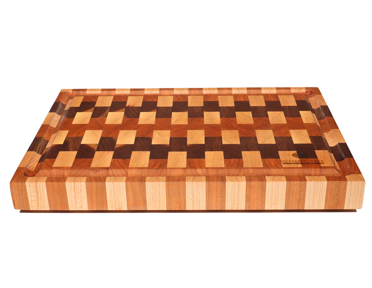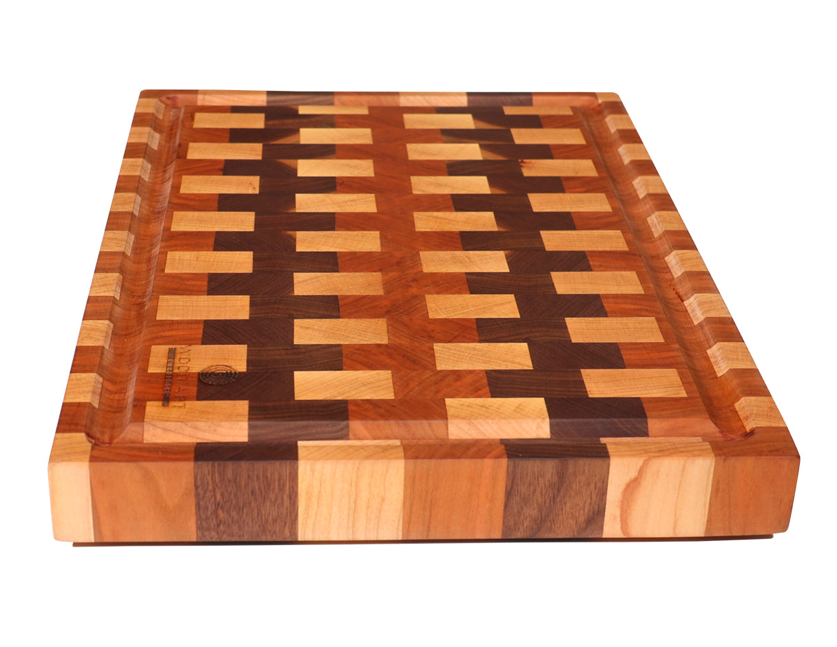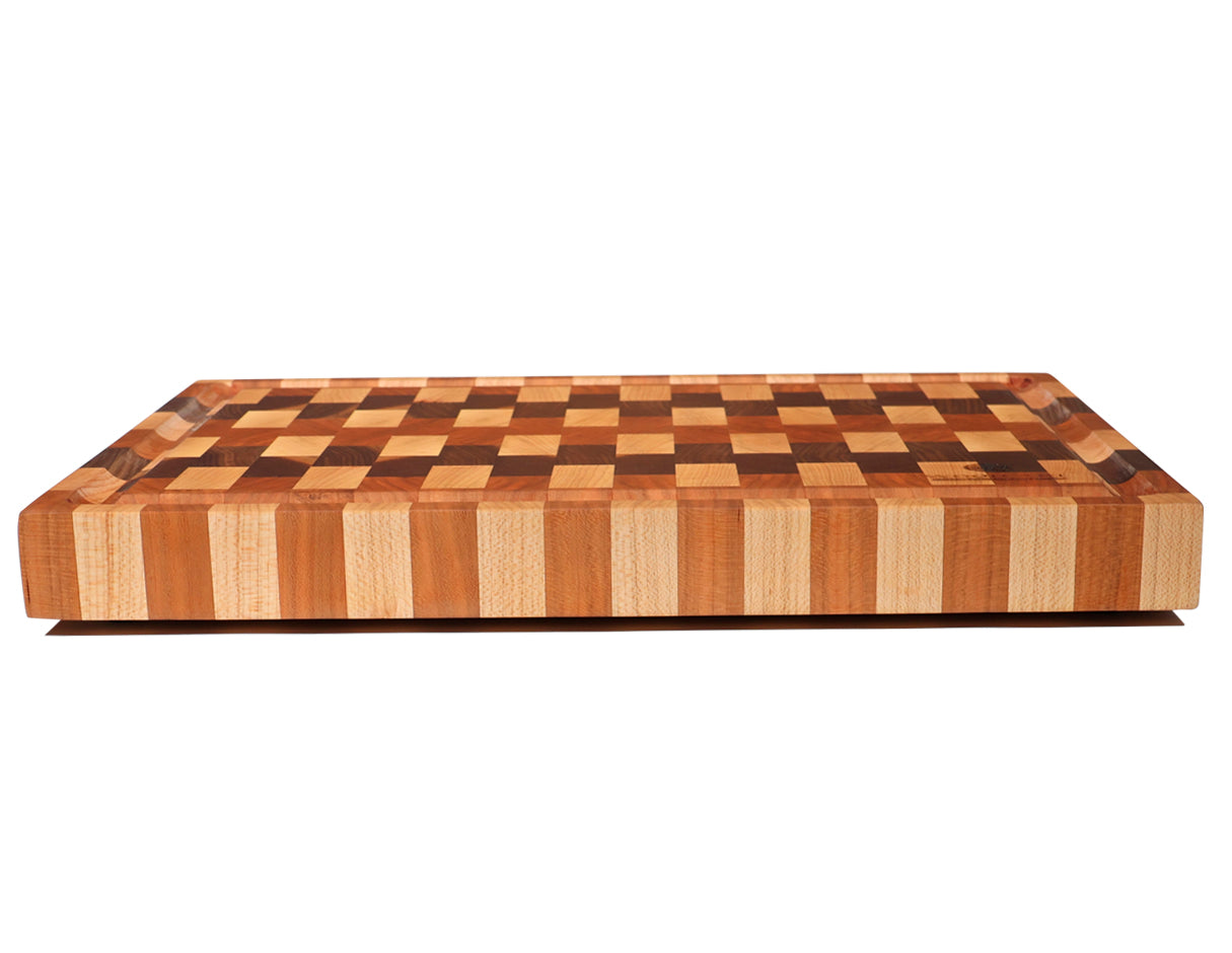Nuestra tabla de grano final es una pieza artesanal única, elaborada con maderas nobles como nogal, maple y cerezo. Gracias a su diseño de grano final (end grain), ofrece una superficie de corte extra resistente y suave, ideal para conservar el filo de tus cuchillos por más tiempo.