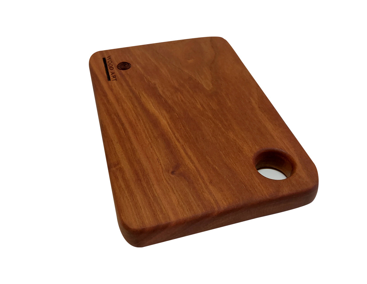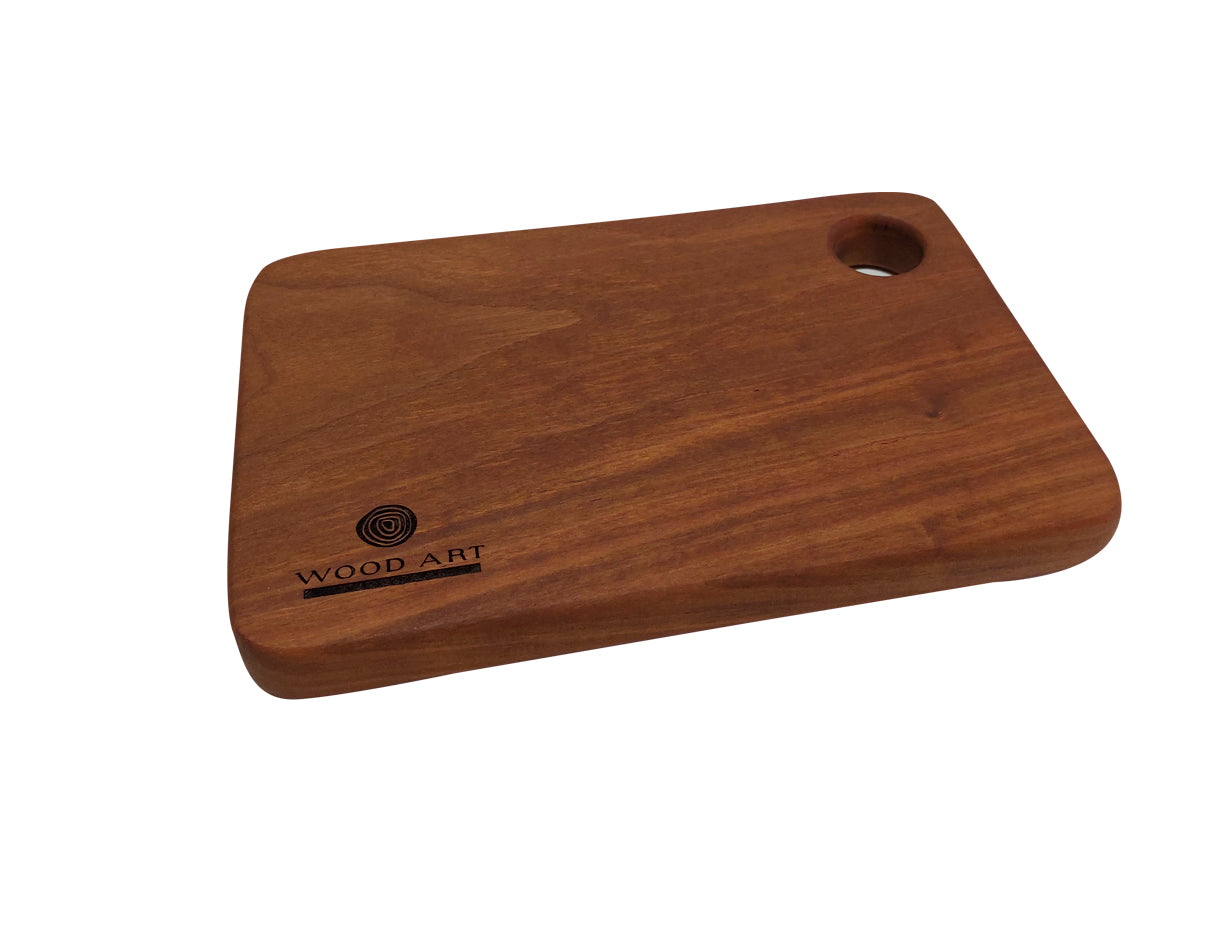 Hecha a mano con madera de cerezo, de tonos rojizos, es una tabla compacta y elegante, ideal para tareas rápidas o como tabla auxiliar. Su superficie suave protege el filo de tus cuchillos y mantiene los ingredientes en su lugar mientras cocinas.
