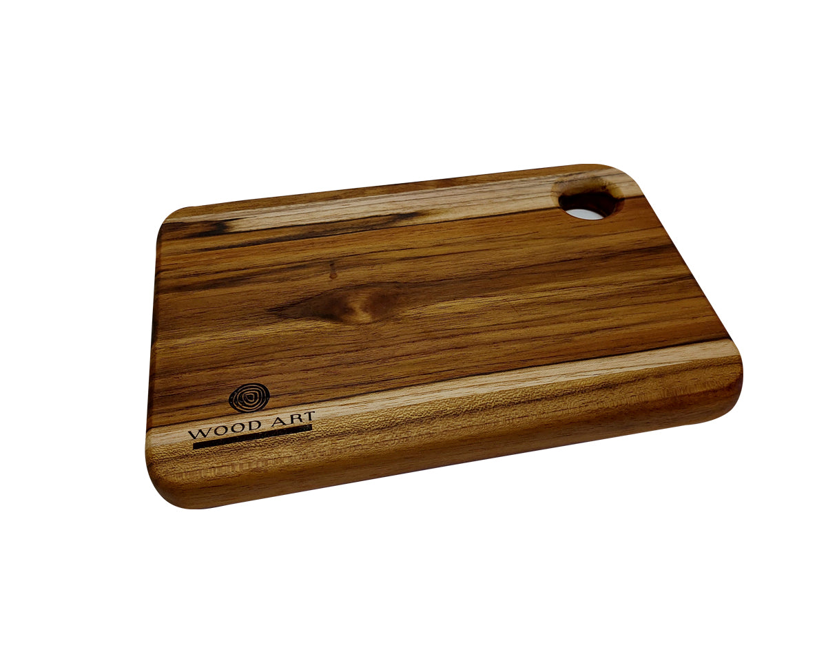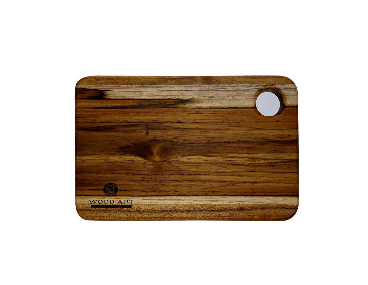 Esta tabla compacta y elegante está hecha a mano con madera de teka, considerada una madera preciosa, reconocida por su durabilidad y belleza natural. Su tamaño la hace perfecta para tareas rápidas o como tabla auxiliar en tu cocina.