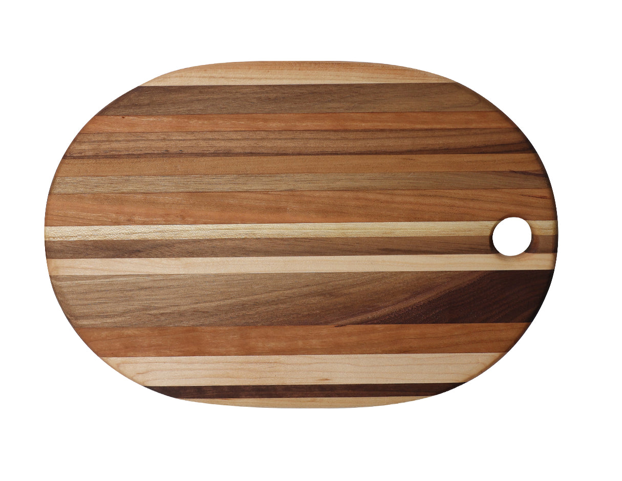 Esta tabla ovalada es elaborada seleccionando meticulosamente tres tipos de maderas duras, nogal, cerezo y maple. Por la dureza y belleza de estos materiales es ideal para el cuidado de tus cuchillos al mismo tiempo que realza el estilo de tu cocina y tu mesa.